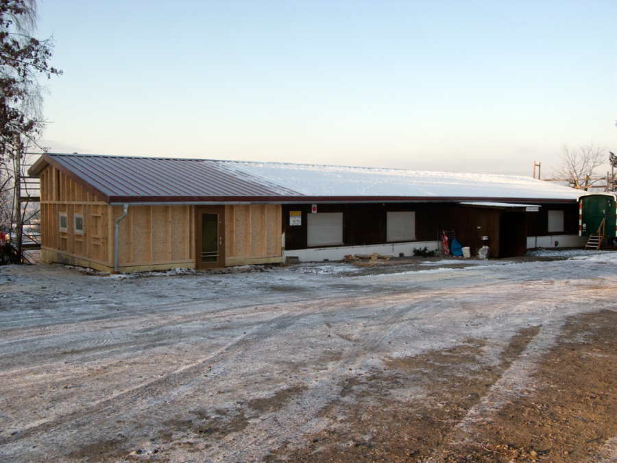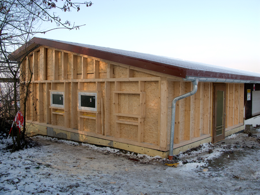 In verschiedenen Bauabschnitten wurde zunächst das komplette Dach erneuert und mit Wärmedämmung versehen. Danach wurde der Toilettentrakt komplett neu errichtet, die Dusch- und Sanitäranlagen um Untergeschoss wurden saniert, die Giebelseite wurde komplett isoliert und neu verkleidet und zum Schluss wurde schließlich noch der Eingangsbereich neu gestaltet und mit einer hellen, freundlichen Eingangstüre versehen.