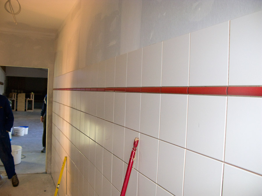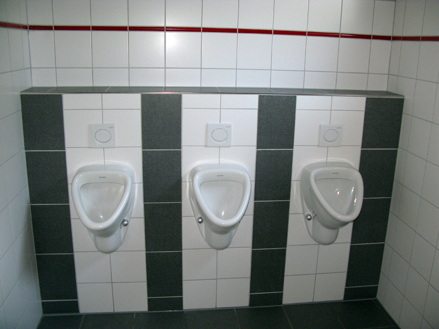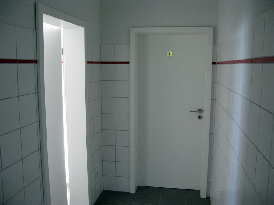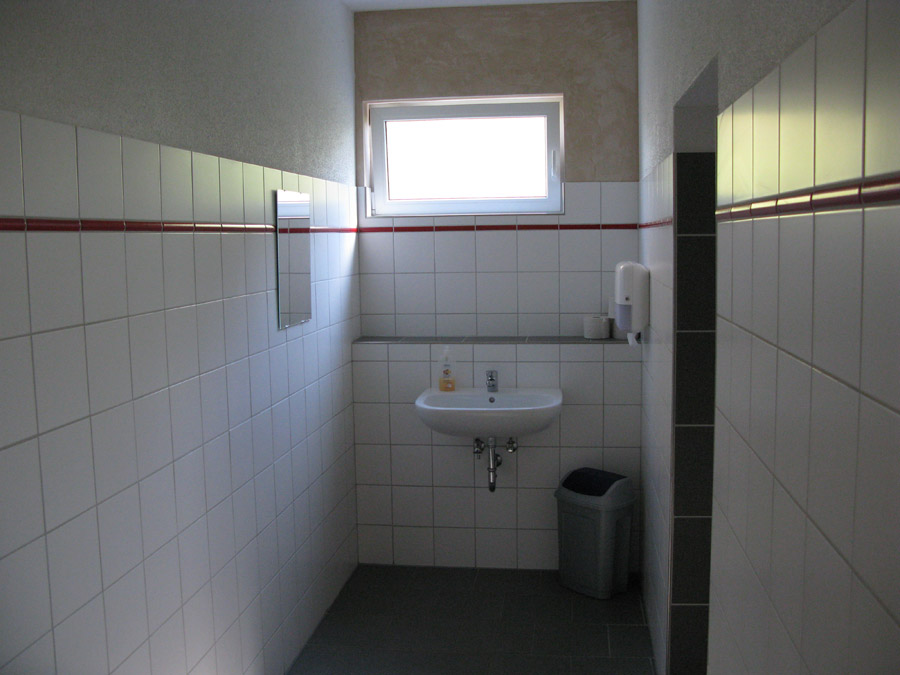 Den meisten Aufwand verursachte der Neubau des Toilettentrakts, der sich nach dem Ende der Bauarbeiten in neuem Glanz präsentiert. Leitmotive, wie Funktionalität, Qualität und Zeitlosigkeit standen bei den Baumaßnahmen im Vordergrund. Dass sich die hellen und Licht durchfluteten Toilettenräume nun in den Vereinsfarben präsentieren, steht nicht im Widerspruch zu diesen Vorgaben, denn die weißen Wandfliesen durchzogen von einer roten Bordüre und die dunkelgrauen Bodenfliesen sind robust und gut zu reinigen. Neben den Toiletten entstand gleichzeitig ein geräumiger Raum zur Unterbringung von Gerätschaften zur Sportplatzpflege.