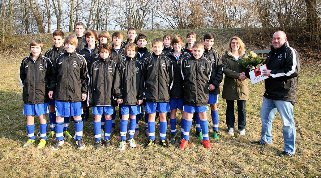 Das Bild zeigt die C-Jugendfußballer mit ihren neuen Jacken, v.l. Tim Friedrich, Simon Schaffnitt, Justin Müller, Lukas Orth, Tobias Heldmann, Jonas Hillebrand, Sascha Schantz, Sebastian Stolper, Trainer Harald Heldmann, Lukas Diehl, Fabio Capone, Christian Neuberger, Fabian Ramge, Jonas Hornung, Trainer Angelo Reeg, Louis Gunkel, Marc Schönleber, Ute Friedrich und Trainer Thomas Gunkel.