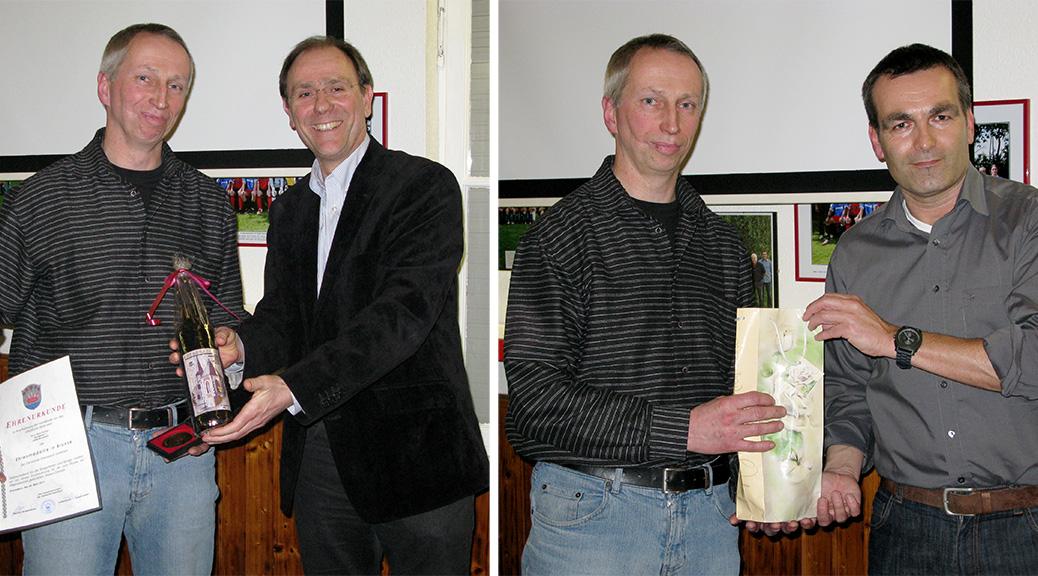 Während der ordentlichen Mitgliederversammlung der SG am 8. März wurde Hans Schöps (jeweils links im Bild) mit der Bronzemedaille der Gemeinde Brensbach ausgezeichnet. Damit wurde die außergewöhnliche und langjährige ehrenamtliche Arbeit des stellvertretenden Vorsitzenden der SG honoriert. Die Ehrung nahm der Vorsitzende der Gemeindevertretung Rainer Müller (2.v.l) sowie der 1. Vorsitzende der SG, Jürgen Abraham (r.) vor.