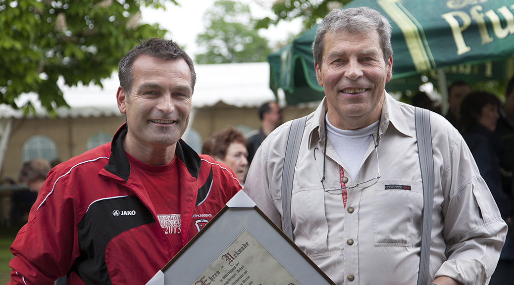 1. Vorsitzender Jürgen Abraham (links) würdigte die Verdienste des langjährigen Vorsitzenden in einer kurzen Ansprache und übergab Reinhard Ihrig unter großem Beifall die Ernennungsurkunde.