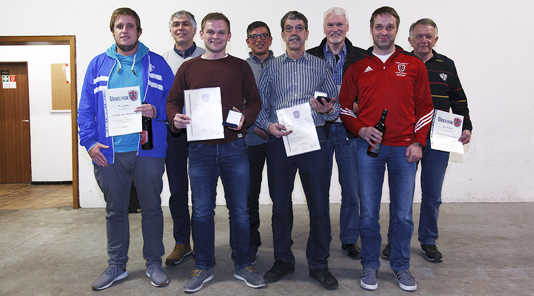 Für 15-jährige Mitgliedschaft wurden Florian Jöckel (li.), Sebastian Pototzki und Frederik Lange geehrt. 25 Jahre sind Axel Müller, Diana Bartmann, Gerhard Didion (2.v.l.), Christoph Müller, Thomas Fornhoff, Manuel Eidenmüller, Thomas Götz (4.v.l.), Jochen Schimpf (2.v.r.), Peter Kabel, und Daniel Schielke Mitglied bei der SG. Bereits seit 40 Jahren halten Kurt Krämer (re.), Richard Weidmann und Klaus Frank der SG die Treue.